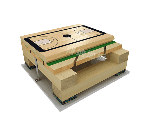 雙層龍骨斜鋪結(jié)構(gòu)采用LVL或?qū)嵞君埞钦w懸浮式安裝,完全符合德國(guó)DIN標(biāo)準(zhǔn),用特定螺栓連接上下龍骨及彈性墊,在上下龍骨之間加彈性墊,解決了龍骨因接觸產(chǎn)生的異響,并且大大提高了運(yùn)動(dòng)性能。多層板采用實(shí)木松木45°斜鋪,有效提升了多層板的抗變形率,這種結(jié)構(gòu)鋪設(shè)效果比常規(guī)非斜鋪結(jié)構(gòu)效果好。保證了結(jié)構(gòu)內(nèi)具有較強(qiáng)的氣流流通,有效提升了襯板的防變形能力和防潮能力。適用于地暖場(chǎng)館及通風(fēng)效果不佳的各種室內(nèi)運(yùn)動(dòng)場(chǎng)館。